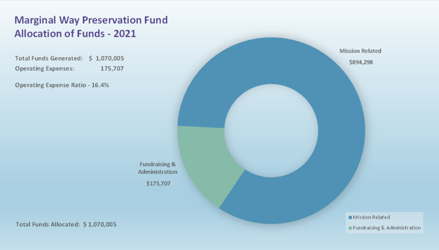 For the year ended December 31, 2021, the Marginal Way Preservation Fund allocated $1,070,005, or 100% of funds generated for the year. Funds allocated to mission-related activities were $894,298 (83.6%), which consisted of both support for the Town of Ogunquit in funding Marginal Way initiatives, as well as allocation to the Fund’s endowment and reserves. Fundraising and other fund administration expenses totaled $175,707 (16.4%). These expenses included direct fundraising related expenses, such as plaque, event and appeal expenses, as well as fund administration costs such as payroll, outside services and other miscellaneous administrative costs.