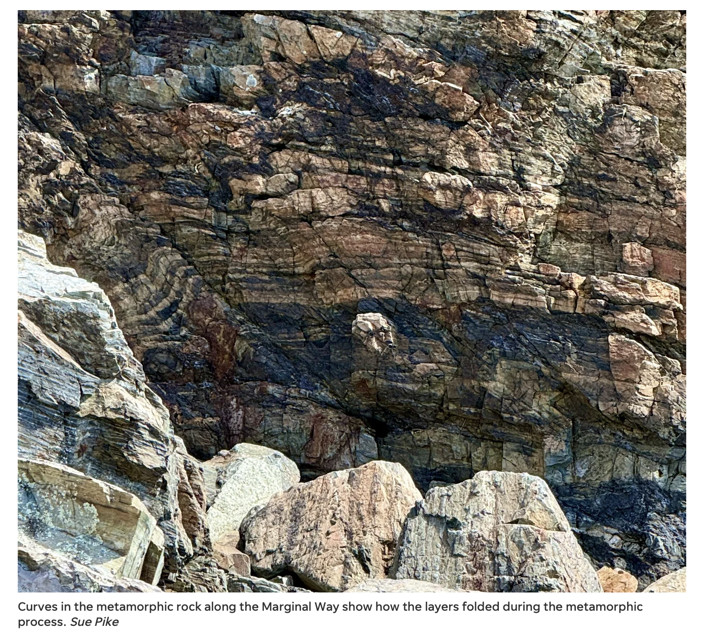 The Kittery Formation is composed of layered sedimentary rock, sandstones, and mudstones that have been metamorphosed, changed by heat and pressure. You can still see the layering from when this was sedimentary rock, but it is often distorted into wavy lines. There are even places where you can see the rock folded back on itself during metamorphism. Look for this next time you visit the Marginal Way. Look also for the informational sign that points out many of the geological highlights.
